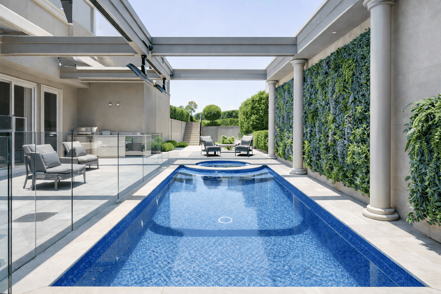 Outdoors, a private resort-style setting awaits, complete with a stunning pool, alfresco entertaining zones, and lush vertical greenery, offering a tranquil escape while remaining perfectly suited for hosting.