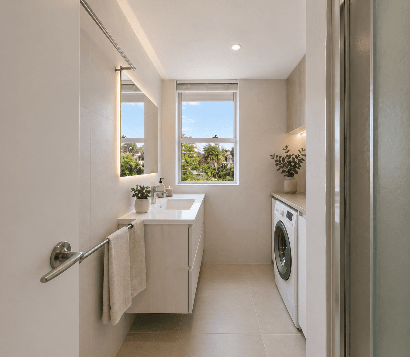 • One bathroom with clean finishes and integrated laundry for everyday ease