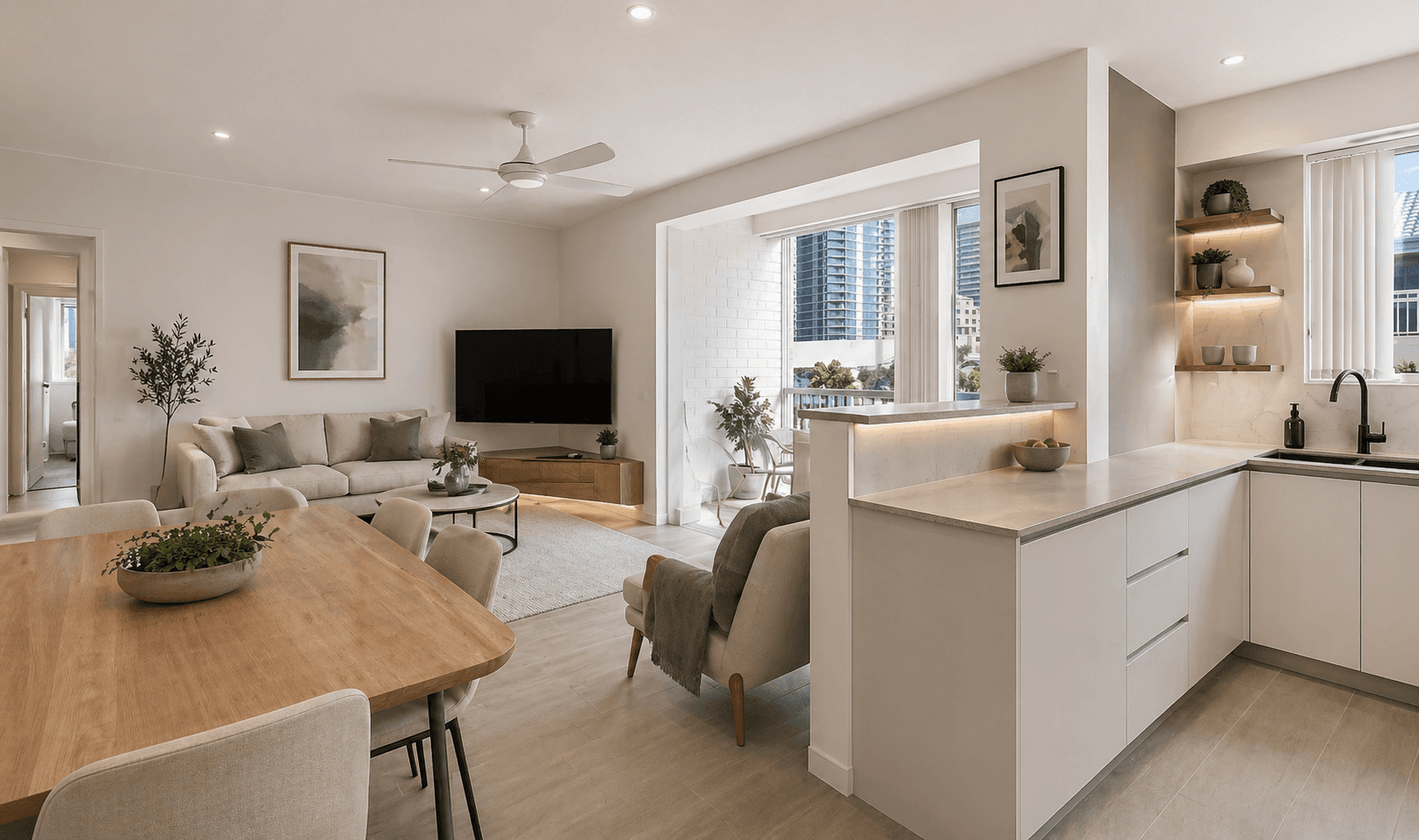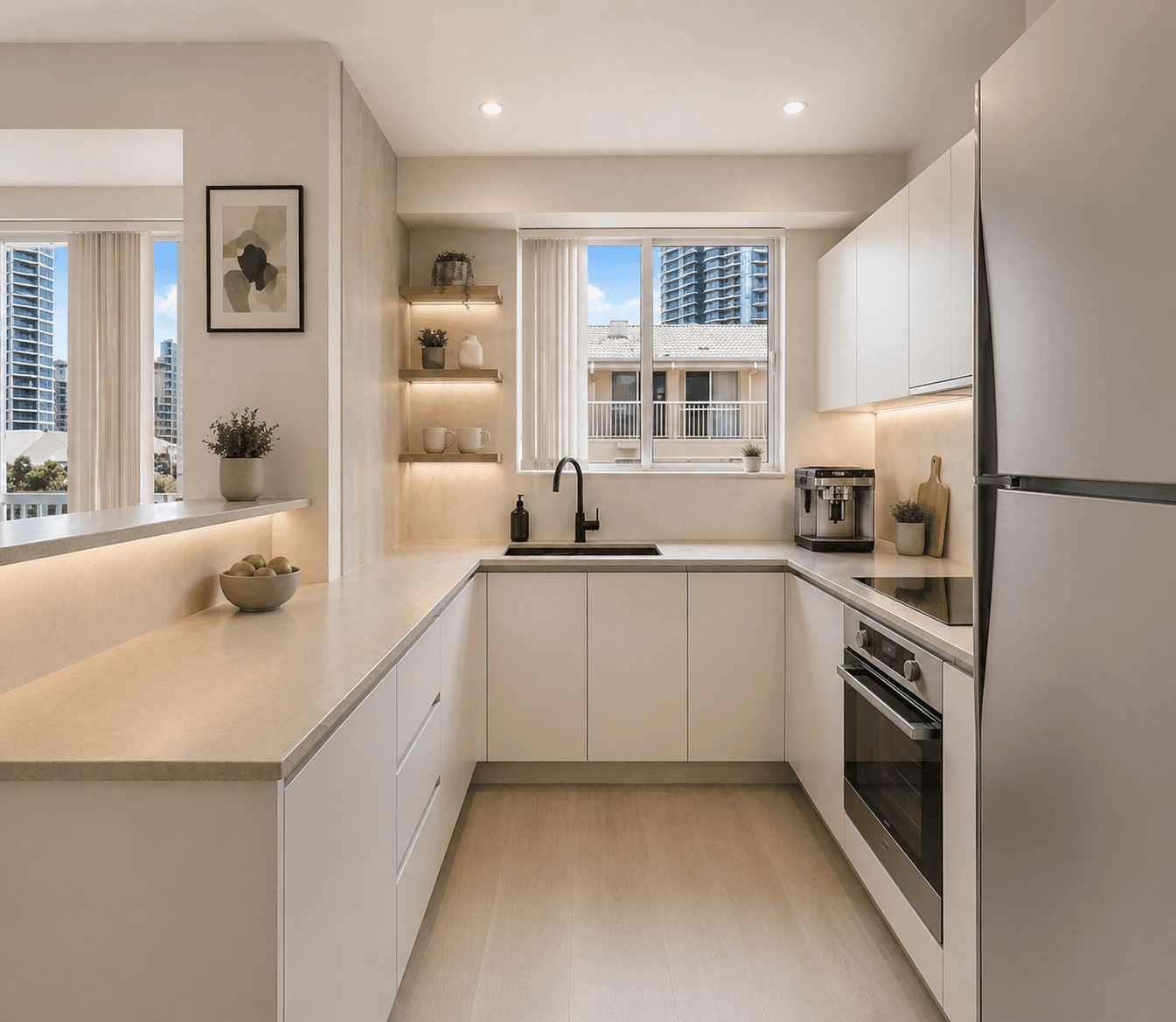 Designed to feel calm, functional and effortlessly liveable, the home features a light filled open plan layout that connects seamlessly to a private balcony, inviting in coastal breezes and a relaxed lifestyle setting. Soft neutral tones and updated finishes create a warm and welcoming interior, while the kitchen is thoughtfully designed with stone surfaces, quality appliances and ample storage.