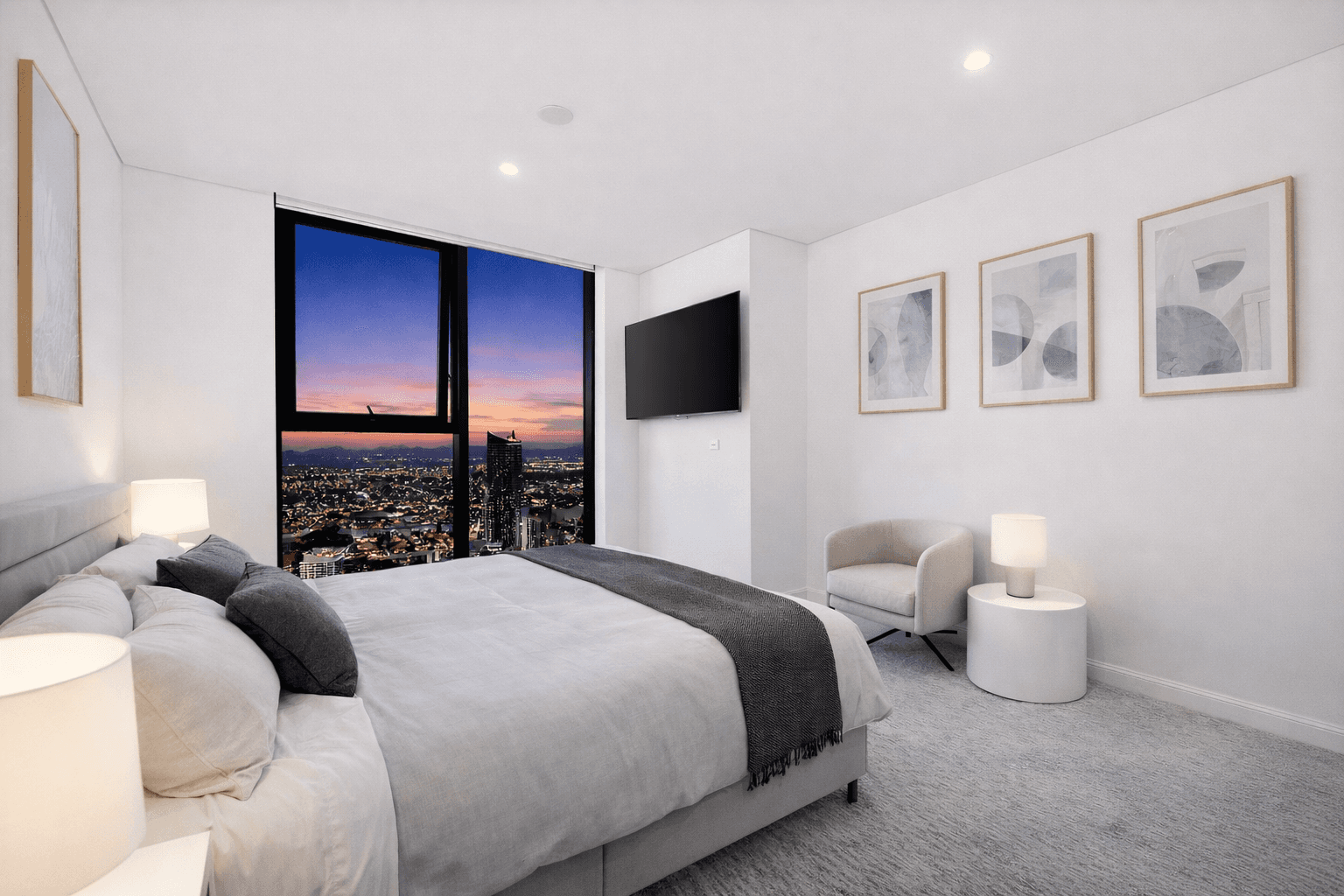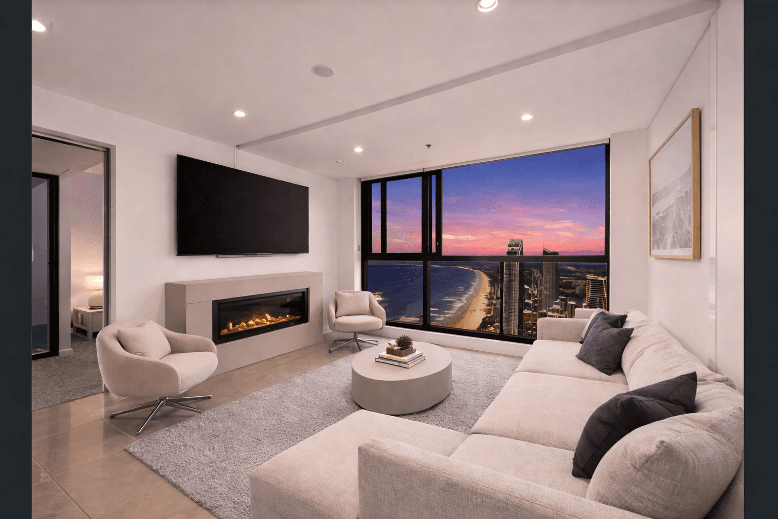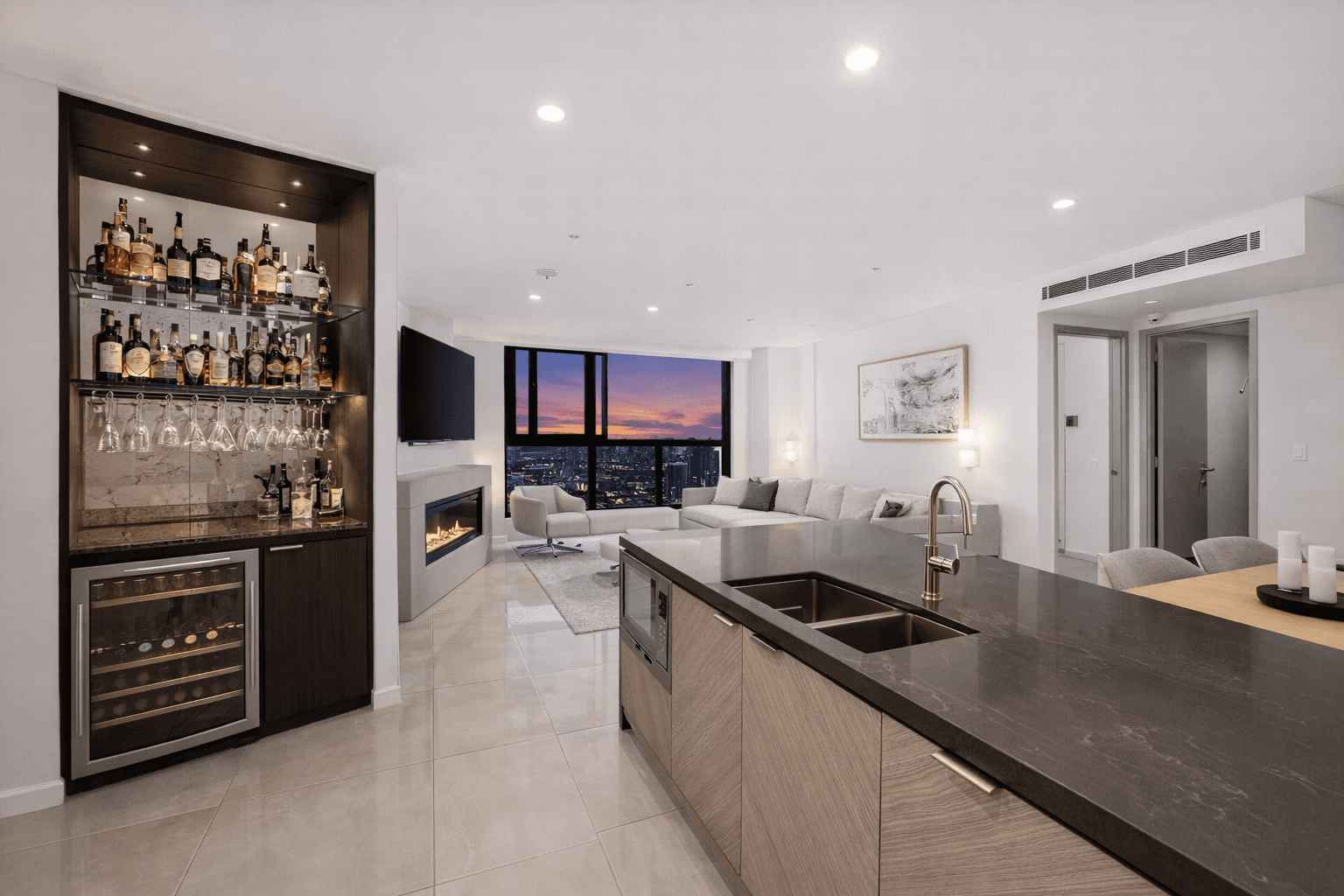 Expansive floor-to-ceiling windows frame uninterrupted vistas stretching across the coastline and city skyline, creating a constantly evolving backdrop from sunrise through to sunset. The open-plan living and dining zone is designed to maximise both space and outlook, seamlessly connecting to a sleek, modern kitchen complete with premium finishes and a statement island.